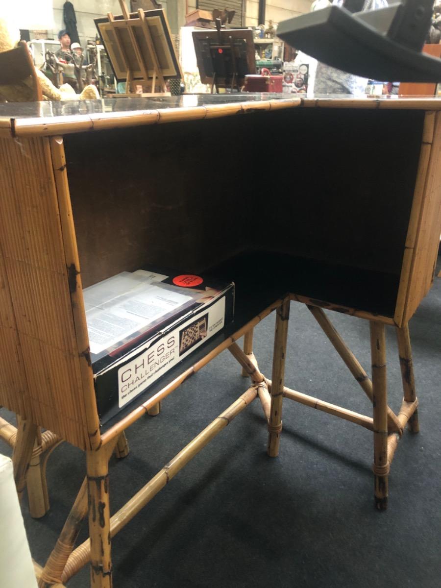 Bar vintage en rotin avec 2 tabourets attribué à Audoux & Minnet ,, ca1970, dim. 110x70x105cm , très bel état.