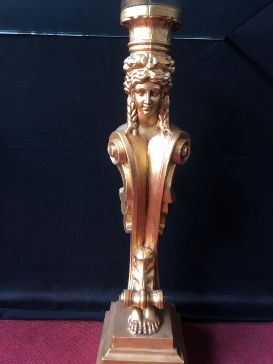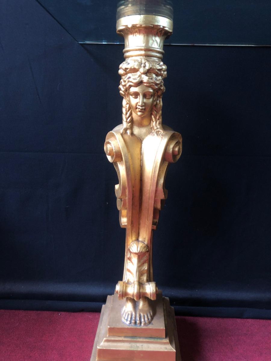 Console avec deux colonnes caryatides en platre dorée à la feuille d’or début 20 eme s avec plateau de verre fumé bizauté H 90cm plateau L120cm x 45cm