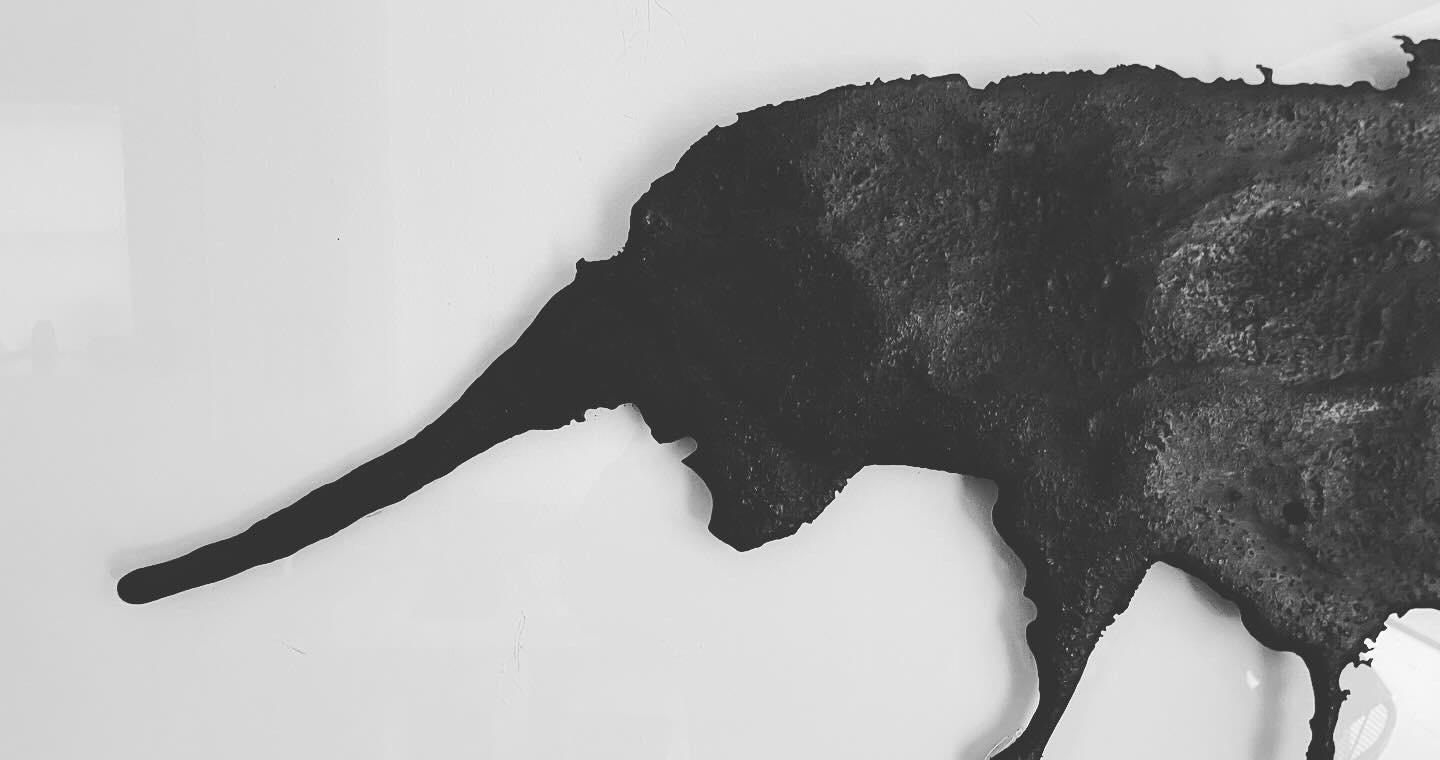 Grande sculpture zoomorphique de P. Blavier en métal montée sur plexiglass, oeuvre unique, ca. 1980, dim: 104 x 39 cm hors support.
