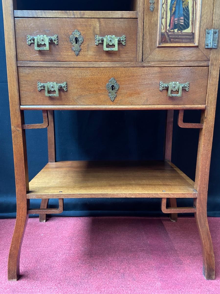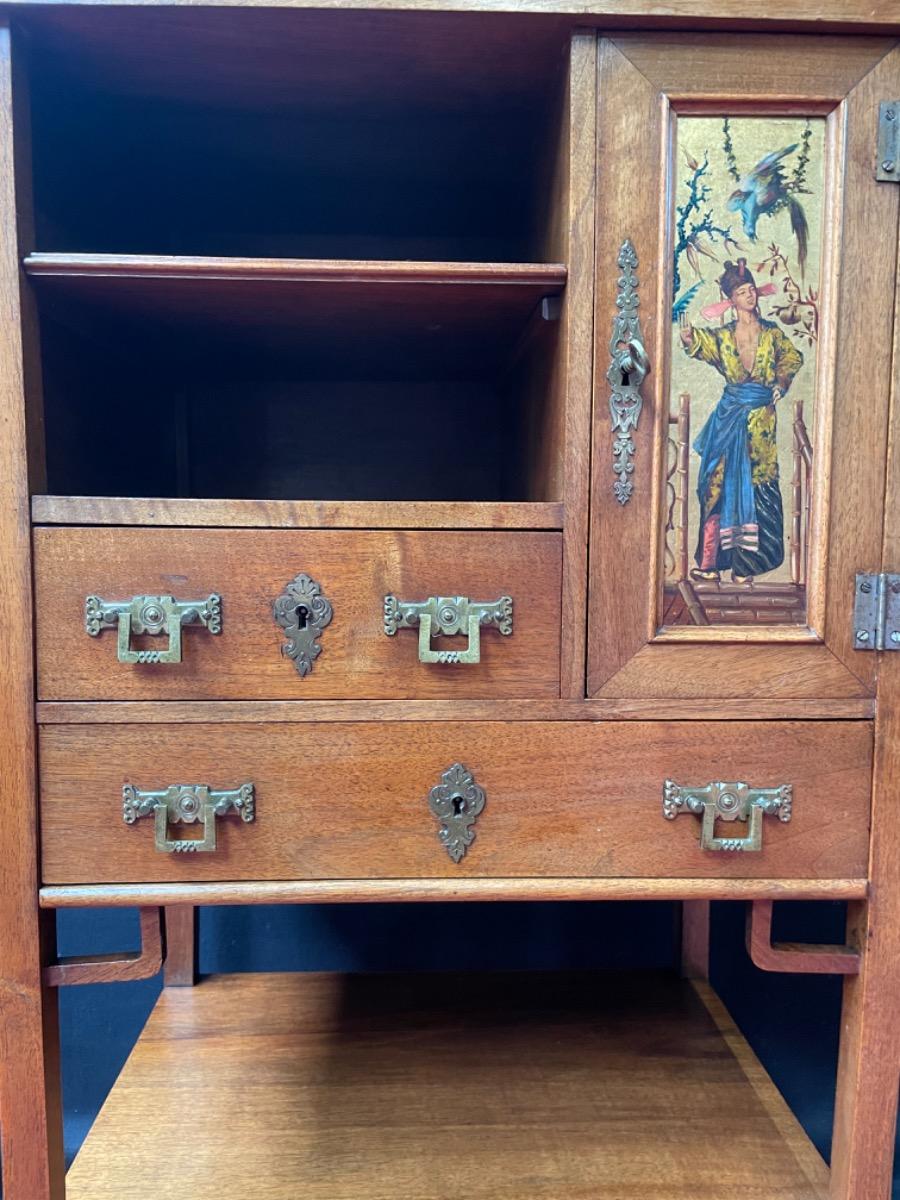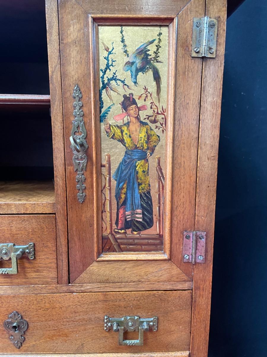 Petit cabinet en « chinoiserie » en noyer massif, décor à la feuille d’or, ca 1900, tiroirs en gradin avec galerie, dim: 119x57x37cm