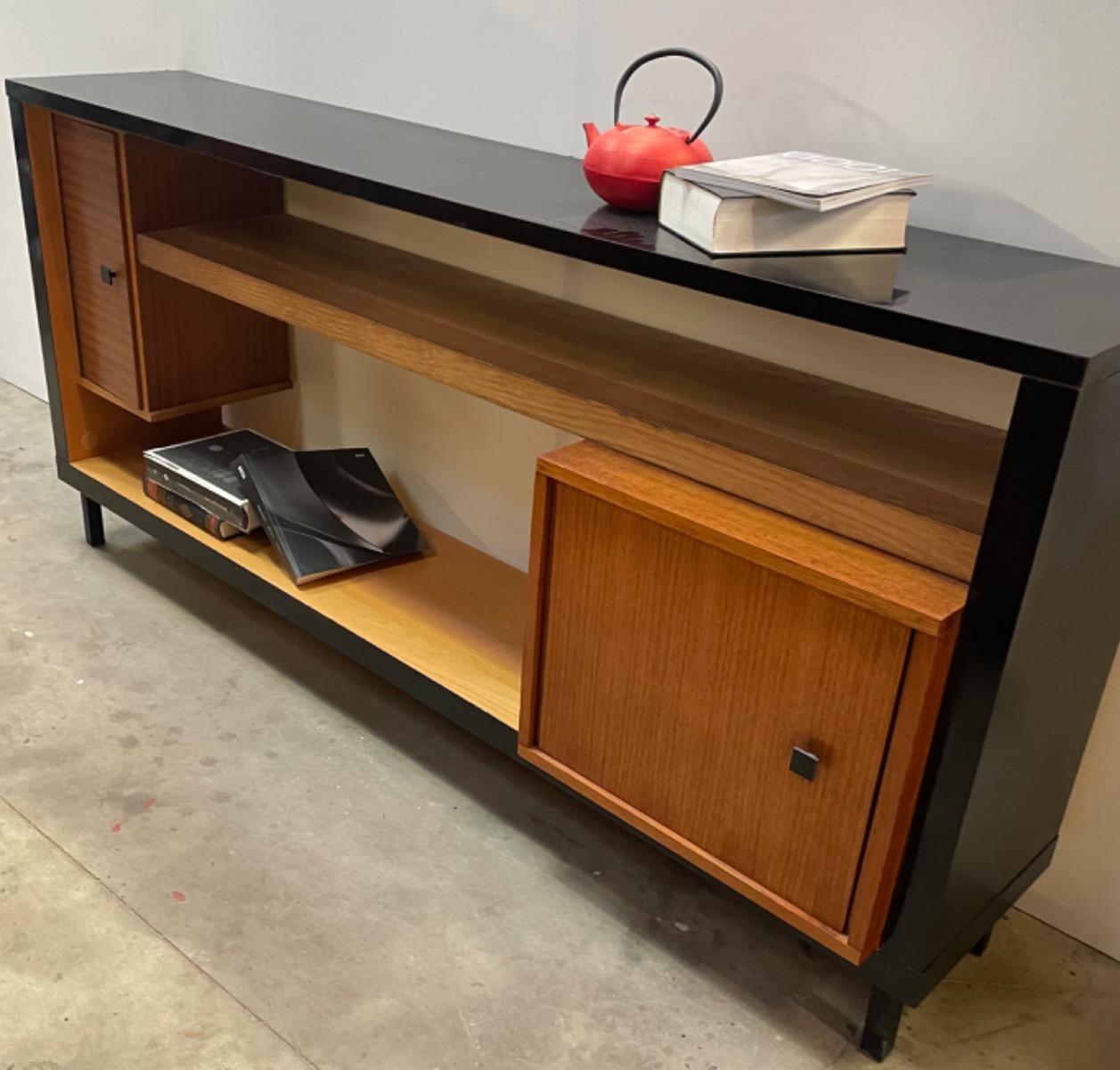Sideboard vintage bookcase avec deux rangements fermés et plateau central , modèle unique de commande, piétement métal noir, ca 1960, dim: 190x42x95cm chez Cie Recamier.