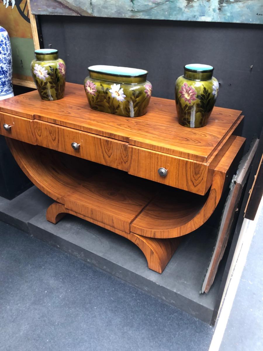 Console art déco en noyer piétement en berceau, 3 tiroirs en façade, restaurée 90x140 cm
