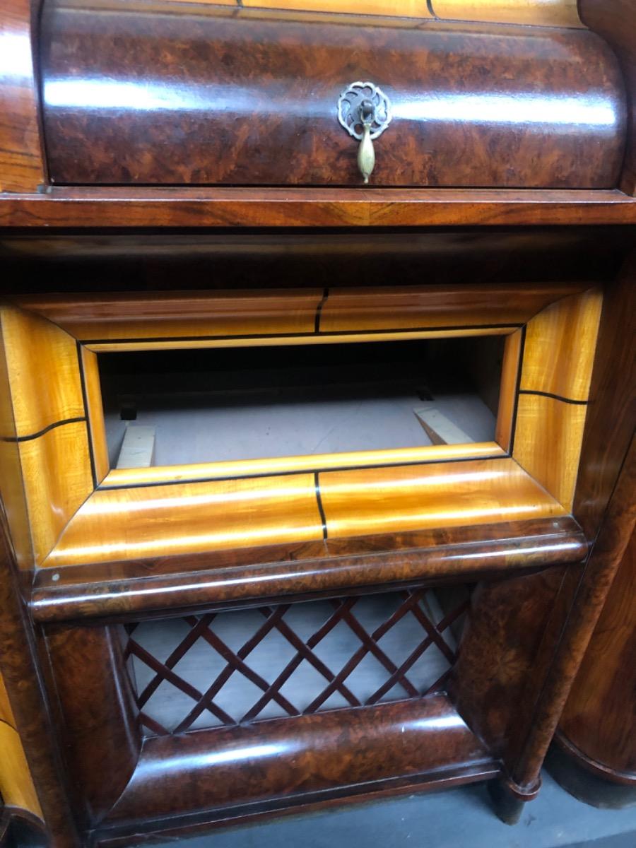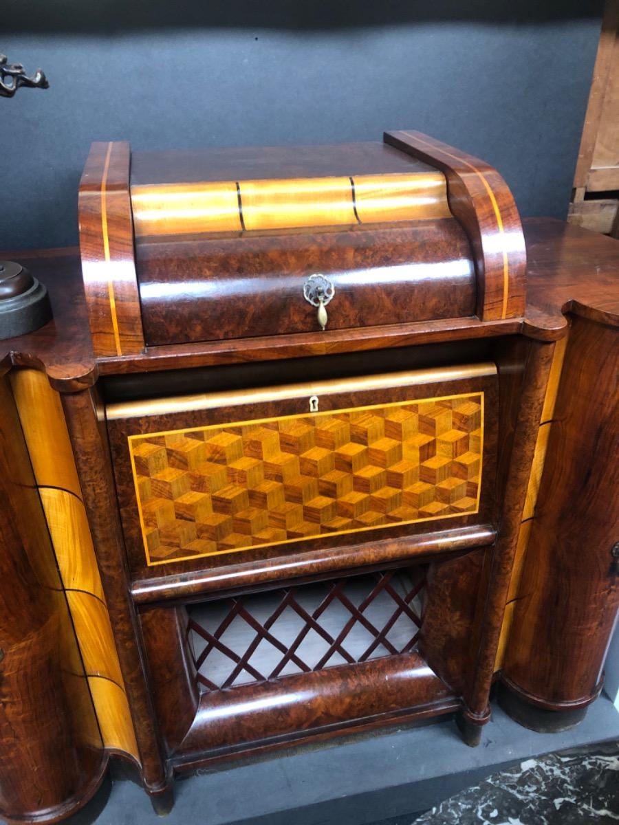 Meuble radio art déco en noyer , sycomore et divers bois précieux, 2 portes colonnes, 105x120x50cm , restauré